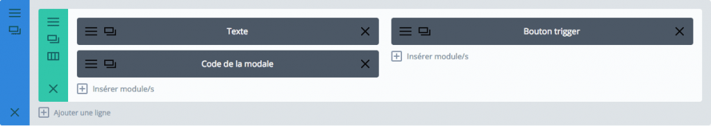 Cette section est peut-être déjà existante dans votre template, tout dépend de votre mise en page… quoi qu’il en soit, c’est ici que vous allez ajouter un module Code et un module Bouton qui servira de trigger (déclencheur) pour ouvrir la modale.